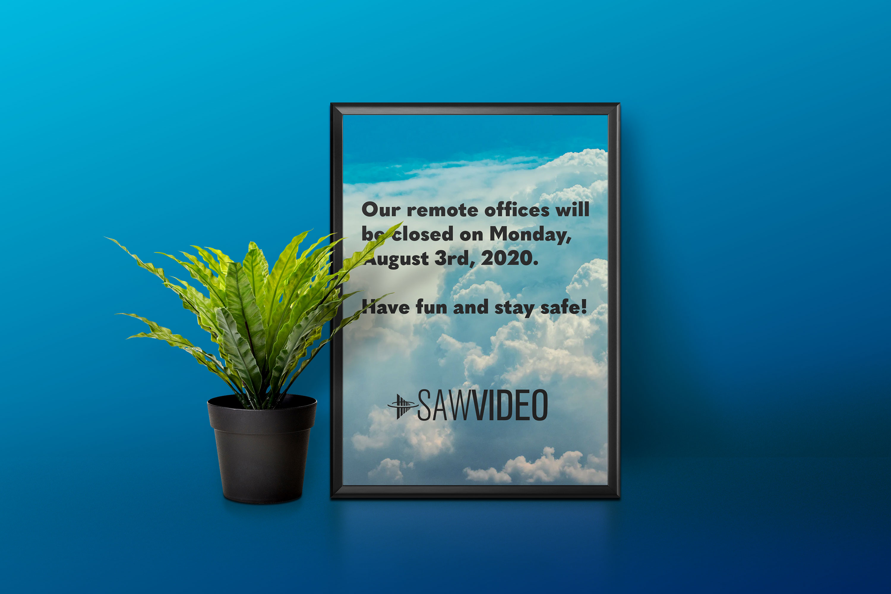 July 30, 2020 SAW Video's remote offices will be closed on August 3rd, 2020. We'll be back to (virtual) business on Tuesday. Get some sunshine, have some fun, wash those hands, and be safe!
